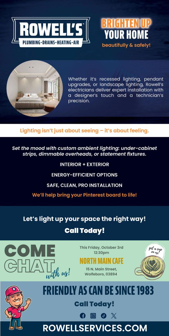 "Friendly As Can Be Since 1983!" When you need help with your plumbing, drains, heating, cooling or electrical in North Conway, you can always rely on Rowell's Services! Call us now or book online!